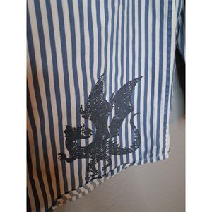 Gymboree Boy's 100% Cotton Blue and White Striped Button Down Long Sleeve Shirt. Features Dragon Graphic. Button on Shoulders. Size Medium (7 - 8). Excellent Used condition.