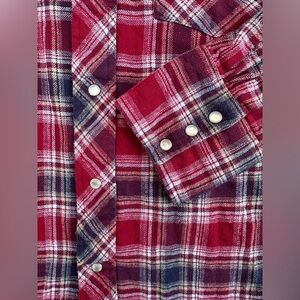 Men’s Large Wrangler Wrancher Red & Blue Plaid Pearl Snap Shirt – 100% Cotton