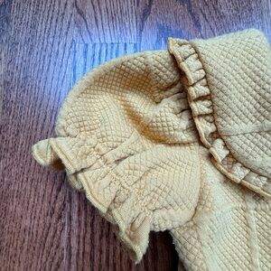 OK condition soft quilted dress with a touch of equestrian style. Sueded waist detail, gold-tone bridle bit, and ruffle edge collar. And we can’t forget the puff sleeves. Give it a twirl. Great mustard color that’s perfect for fall.