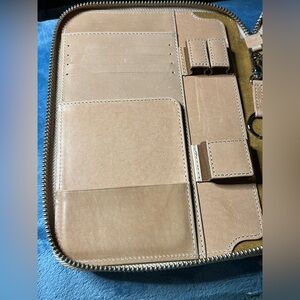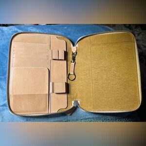 Elegant tan leather portfolio with a secure zipper closure. Perfect for organizing documents.