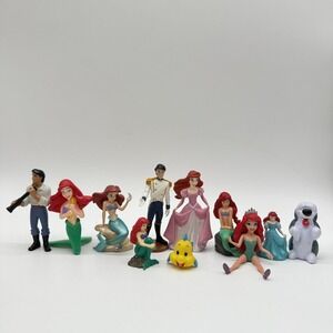 The Disney Little Mermaid Figure Toy Lot includes 11 cake toppers featuring characters like Prince Eric and Ariel. This collectible set falls under the Disney franchise and is inspired by the movie "The Little Mermaid." Made of PVC, these figurines are perfect for any Disneyana collector or fan of this classic animated film.
