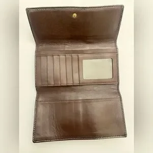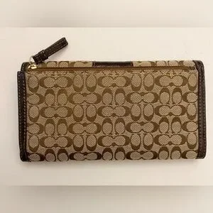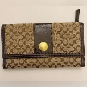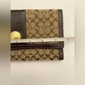 Elegant Coach wallet 7.5โX4 approx with signature pattern. Features a gold button accent.