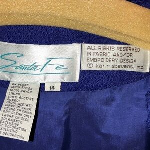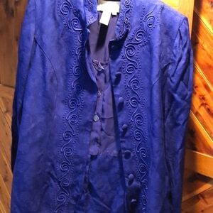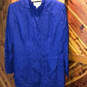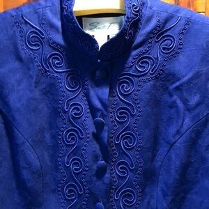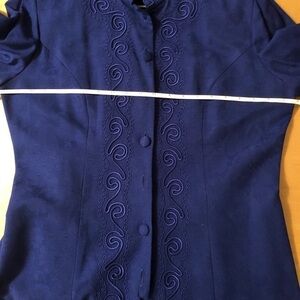 This blue Rayon dress with an embroidery design looks like a suit. It can be worn closed with a Chinese collar or open with a built in acetate shirt (see picture) (needs a clear button) Fully lined with the blue acetate material.