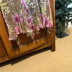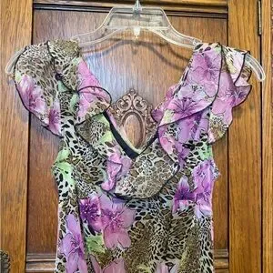 Elegant leopard print dress with beautiful pink and lavender floral design. Beautiful lime and pink bead detailing brings flair to this beautiful deep V-neck in the front and back dress. Neckline has soft ruffle around the front and back. Dress has a 100% contrasting black lining and a whimsical handkerchief bottom. Sleeveless. Maxi Dress. Very feminine with a little vintage look. Ideal for making a statement. 100% silk. Simply gorgeous. Wear it to a wedding, on a cruise ship, date night, or anywhere you want to just feel special and beautiful. It is a fitted dress. See measurements in photos. Has a little bit of stretch. Purchased at Nordstrom. Signature by Robbie Bee.