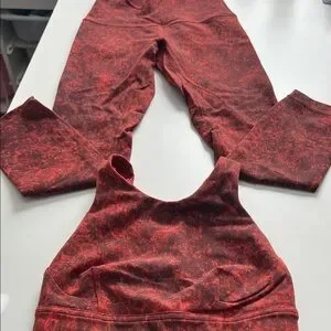 Vibrant red leggings and longline high neck sports bra by Lululemon Athletica. Ideal for active wear. Great for workouts and very compressive. Gently worn.