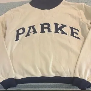 Cozy cream sweatshirt featuring bold blue 'PARKE' lettering. Accented with blue cuffs and hem.
