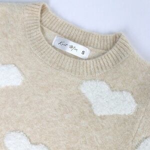 Cream/Tan and White Heart Design Knit Short Sleeve Sweater Size L