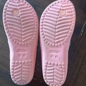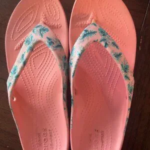 Crocs flip flops size 9. Super cute and comfy but received as gift and after wearing around the house determined too small for me. Minimal signs of wear!