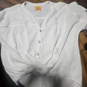 This is a very lightweight nice crisp white shirt with a cute tie in the front and a little bit longer in the back. This is perfect for layering or wearing alone with jeans or shorts even a cute skirt. It's so versatile because it's white.