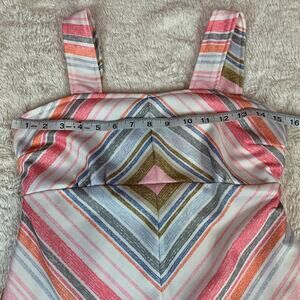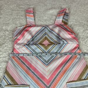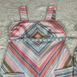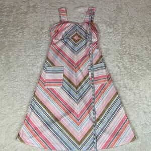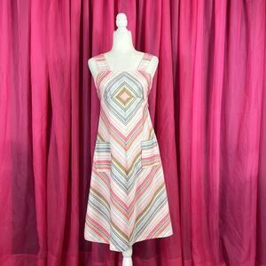 Pleasing a line silhouette with thick straps, attached matching fabric back tie, and a back zip closure. Front patch pockets with slanted geometric lines.Some stretch, but check measurements. Def not a size 10 by today's standards. But such is the way of vintage clothing!