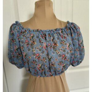 AVA + ESME Short Puff Sleeve Blue/Pink Floral Chiffon On/Off Shoulder Crop Top