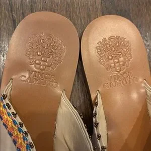 Vince Camuto • leather slip on sandals • beige leather with multicolored design and metal bead trim accent • worn a few times in good condition • size 7M