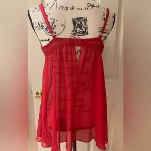 Fun Santa teddy made by Seductive Wear by Cinema. The lingerie is made of a sheer red fabric with sequins on the bra cups and white maribou trim. The lingerie is a 2 piece set with a g-string panty and a fun teddy. The teddy fastens in the back like a bra and has adjustable straps. It is a size large.