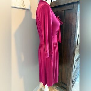 Stylish Trina Turk fuchsia dress with long sleeves. Features a tie-neck detail, gatheted waist, a hidden side zipper. Gorgeous saturated color! This is a pre loved dress in EUC and has recently been dry cleaned. Size 4. 96% viscose, 4% elastane. P2P- 18 inches, waist- 14 1/2 inches, hips- 25 inches, length- 36 inches.