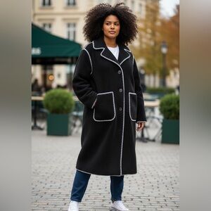 NWT Elegant black teddy coat with cream detailing. Perfect for warmth and style. Contrast blanket stitching brings striking detail to this longline coat built for cozy comfort with high-pile fleece construction.