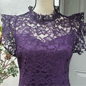 Enfocus Studio Purple/Eggplant Lace Dress Lined Modest Minimalist Wedding Guest Size 8. High neck, butterfly sleeves, zip enclosure at back. In very good pre-owned condition. Please see approximate flat lay measurements shown on photos.