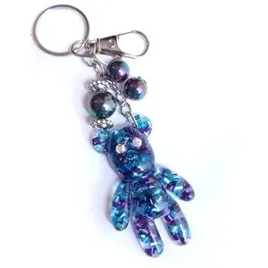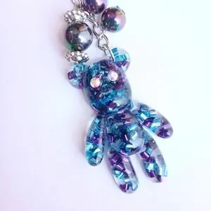 Cute blue and purple Teddy bear keychain bag/purse charm. Handmade with clear resin and confetti. Features aurora borealis rhinestone eyes and titanium rainbow beads. New. Great gift or stocking stuffer!!