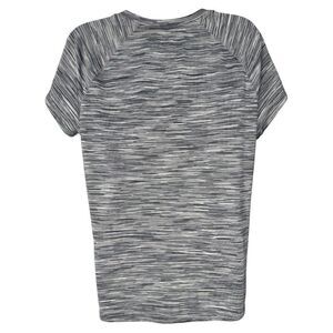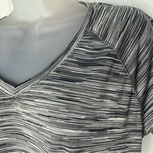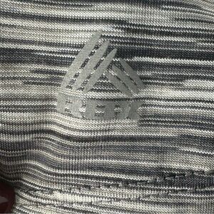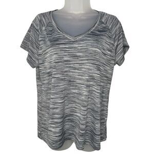 Size extra large. In excellent condition. Colors are gray, black and white. V-Neck; Short Sleeves. 100% polyester.
