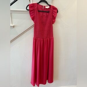 Fun and bright pink dress with ruffle sleeves. 100% polyester. Originally purchased at Nordstrom, worn only 2 times.