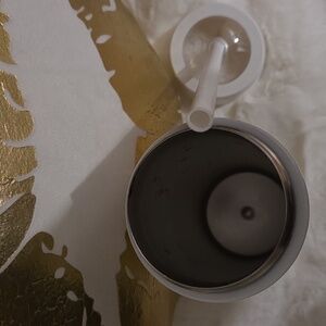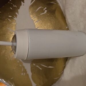 Stylish white Thermos tumbler. Ideal for maintaining drink temperature. Gently used, has few tiny marks but nothing that's super obvious. super white, clean and has clear windows on top. super cute.