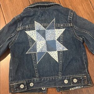 Classic denim jacket with a distinctive tan patch. Ideal for everyday style.