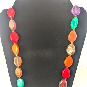 Add a pop of color to your outfit with this vibrant beaded necklace. Perfect for any occasion. Approximately 17" long.