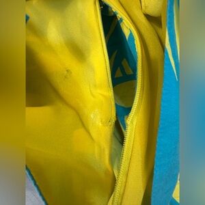 In pre-owned condition - spots/scuffs, tearing/snags, some tearing that has been stitched up, words fading on interior label, metal brand tag fell off & zipper is broken and will need to get replaced