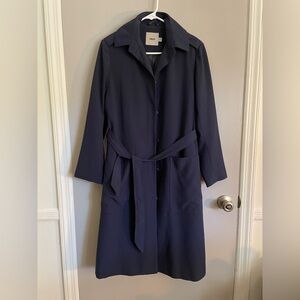 Stylish light weight navy blue trench coat with a classic design. Perfect for early fall or spring. Incudes pockets and comes with a removable tie belt. Great condition.
