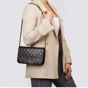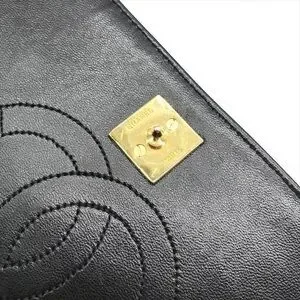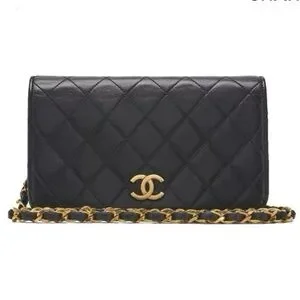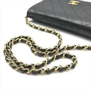 Authentic vintage black flap Chanel bag with the iconic CC gold hardware detail. There is a hallmark on the CC showing us that the gold hardware is plated in 24k gold. Chanel stopped plating with real gold in late 2008. There are some lovely Chanel branding details on this bag, under the flap the CC is stitched. this model was made between 1986-1988. Interior lining has been replaced. Clasp is difficult to open and close. Light scratching to leather throughout. W approx. 19 x H approx. 12 x 3 cm, Chain approx. 90 cm.