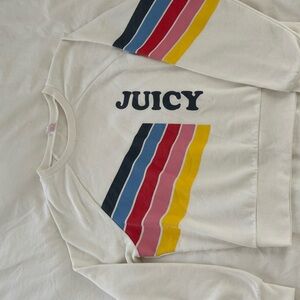 White set featuring bold stripes in red, pink, blue, and yellow. Juicy logo is navy blue, same as the stripe. Zip up ankle, wide leg.
