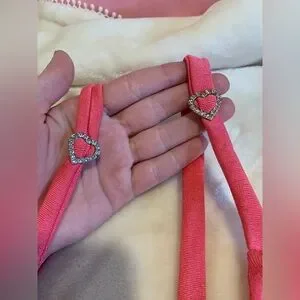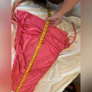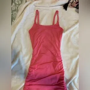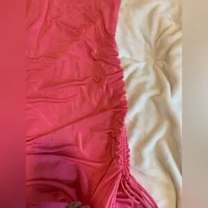 Super stunning pink dress. I don’t remember where i bought this but it was years ago. worn a handful of times no tears or stains. This dress has these cute diamond hearts on the strap that can be moved wherever, it also has 2 ruching details that can tie on both sides to make the dress longer or shorter. I feel like this dress could fit anywhere from a medium to xxl because of how stretchy it is being the length can be changed