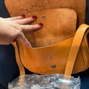 Francesco Biasia "Genuine Leather Made in Italy" Elegant tan leather crossbody bag. Features adjustable strap and sleek buckle detail. Ideal for any occasion.