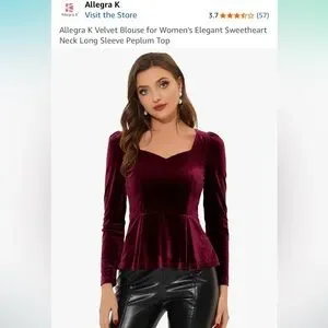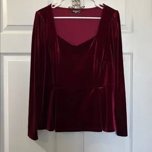 Feminine deep red / wine colored long sleeve top with sweetheart neckline and peplum waist. The shoulders also have a little princess gathered detail. Ideal for fall and winter! Fabric is velvet with stretch! Loved this top but it no longer fits. It’s great for work or holiday functions. Color is rich and soft!