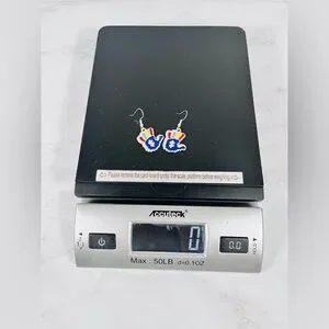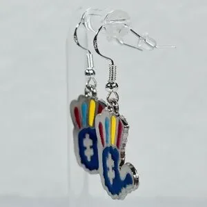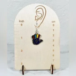Unique Autism hand-shaped earrings with vibrant colors. Features red, blue, and yellow accents.
