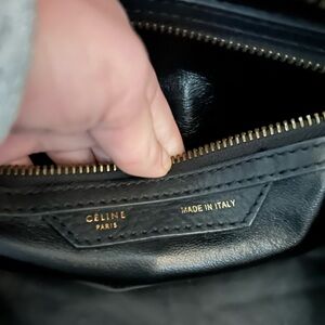 Stylish Celine satchel with a modern design. Features black, white, and brown leather. Perfect for any occasion. It is authentic.