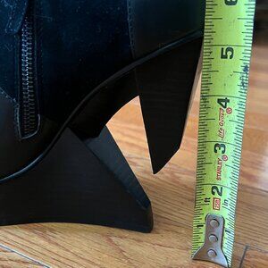 Exquisite UNITED NUDE bootie with unique mind trick heel, which is sure to make a statement. Barely worn, mint condition. Suede and leather. Size 38 (7.5/8). 5.5" heel (including the 1.5' platform)