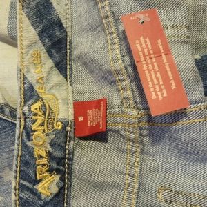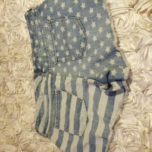 This is a NEW pair of womens denim Arizona shorts. Stars and stripes design. Frayed hemline. No rips or stains. Comes from a smoke free home. Please view pictures for more details.