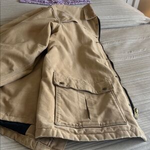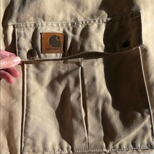This incredible jacket is made by Carhartt with quality and durability. Only very light wear as shown in photos. Zippers function perfectly, heavy duty snaps over zipper to keep out the cold. Polyester flannel lining, until the very bottom becomes black quilted lining, also found lining the sleeves. Bright tan cotton canvas outer and corduroy collar. 2 outer pockets zip, two snap, and two have no closure. One inner pocket. Draw string where plaid meats quilted lining, to close tight against your lower torso, and sleeves have a two setting snap cuff to tighten. Very warm, top of the line Carhartt, crafted in the USA . Only very light wear as shown in photos. Zippers function perfectly, heavy duty snaps over zipper to keep out the black quilted lining, also found lining the sleeves. Bright tan cotton canvas outer and corduroy collar. Clean and no rips, stains or holes . Excellent condition.