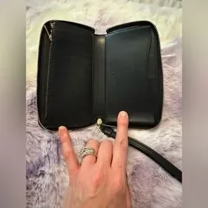 Chic dark brown leather wristlet by Coach. Compact design with a convenient wrist strap. The Medium ID Zip Wallet is a stylish and practical essential for everyday use. Crafted of Signature coated canvas, this medium zip wallet is designed to keep you organized. Its interior features seven credit card slots, a full-length bill compartment and convenient zip coin pocket—all sealed with a zip-around closure for added security. Toss this designer zip wallet in your carryall for a day on the go or grab it when running a quick errand. Room for your phone. Room for cards. Room for your cash. The leather is so smooth and soft. Signature collection. Gold hardware with the stagecoach on the front of this beautiful piece. NWOT. Chocolate! She has her tags inside. Authentic. Pristine.