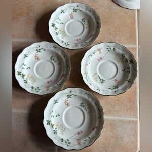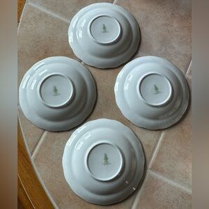 The Southdown pattern is part of the “Majestic Collection” and features a multicolor floral design with green leaves, pink flowers and green trim on white bone china and what looks like a square handle. The saucers have a green trim scalloped edge. $15 each and sold separately. If interested in all, send me a message and an offer.