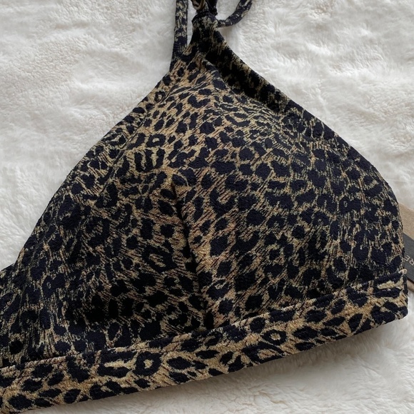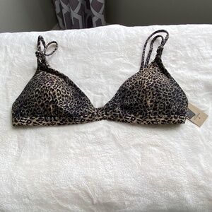 New with tags! Animal cheetah leopard print bikini top. Made with recycled polyester saucy little stringy number is oh so divine and a fun addition to your swim wear draw - Regular fit true to size - Adjustable straps -Metal hook 68% Recycled Polyester 22% Polyester 10% Elastane