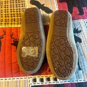 Experience comfort with UGG's grey moccasin slippers, perfect for cozy indoor or outdoor wear.