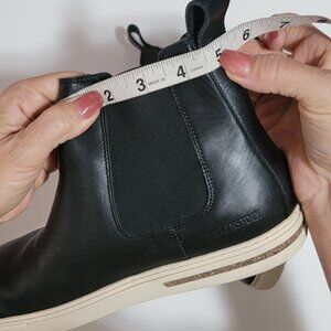 Stylish black leather ankle boots. Cream sole for contrast. Comfortable and durable design.