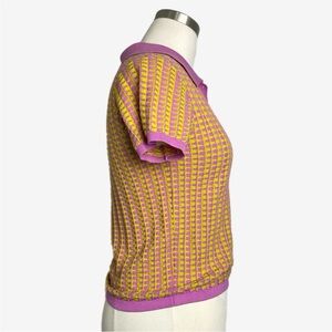 Excellent preowned condition. No visible flaws. Short sleeve shrunken polo. Knit gingham pattern. Collared. Mother of pearl buttons. Fuchsia and citrine color. Ribbed collar, hem and cuffs. Lightweight. Fits more like a small.