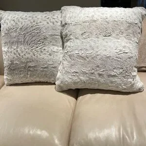 Set of two faux fur throw pillows in a soft cream color. Perfect for adding a cozy touch to any room.