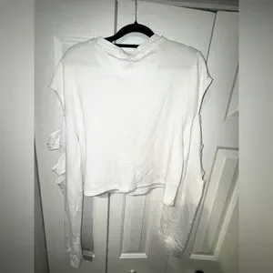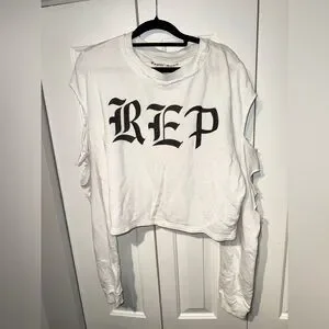White Reputation sweatshirt with distressed style with original tears in the sleeves. It has an oversized, boxy fit. I bought it from another Swiftie but didn’t realize it is oversized. Please see measurements: