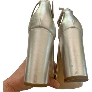 Size 8.5. Excellent condition. Worn once for sister’s wedding. Current style. Silver leather. Adjustable ankle strap. 4” covered block heels. Very minor wear on bottom soles. Inner soles are pristine. Minor scuff on one heel & toe. See photos - photos form part of description.