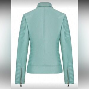 Elevate your style with this chic teal blue polyurethane leather jacket.