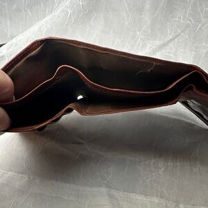 Vintage Coach men's leather wallet. The wallet is brown and features the embossed "COACH LEATHERWARE" logo on the inside.