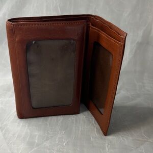 Classic Coach leather wallet, trifold design. Two ID window slots. Two longer bill compartments. Four additional card slots.